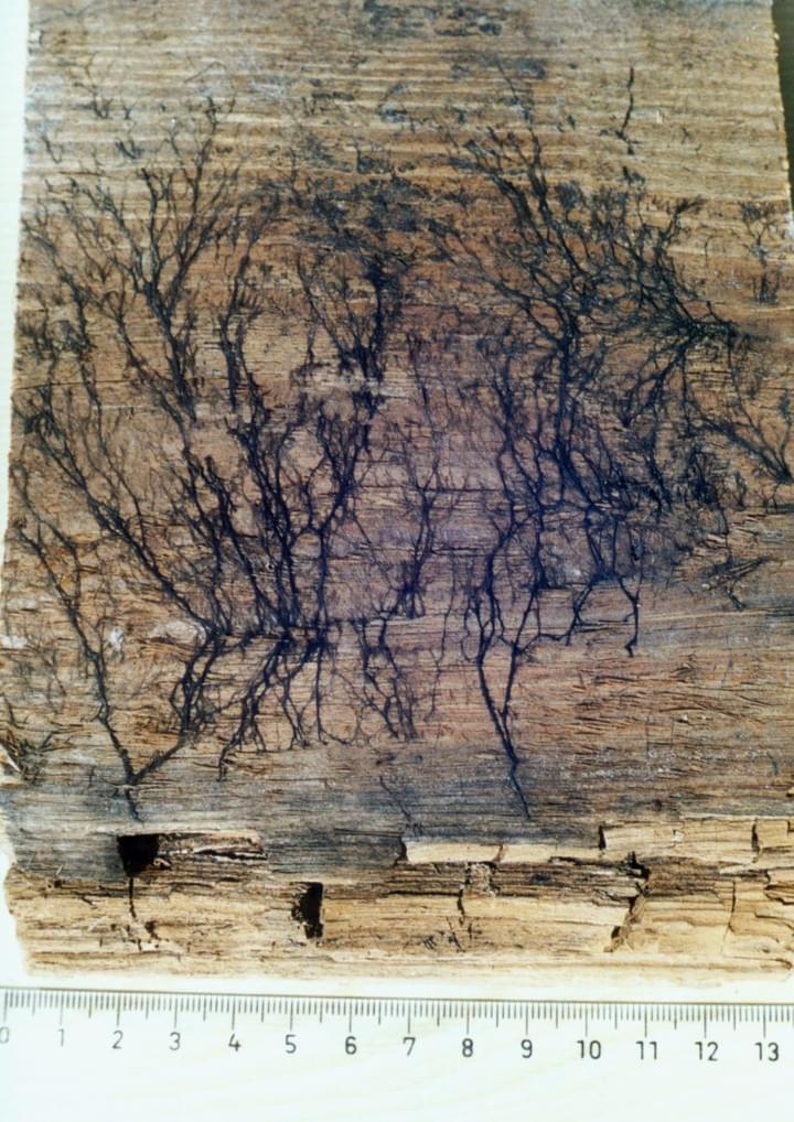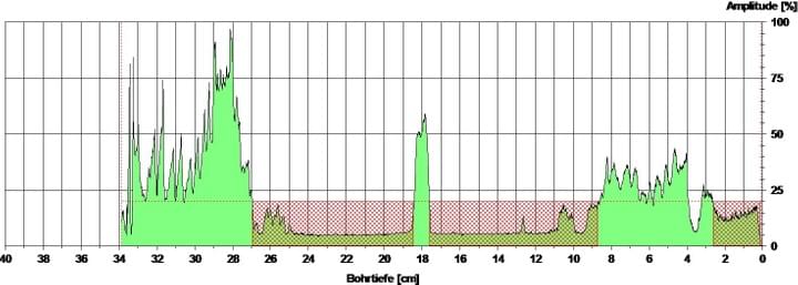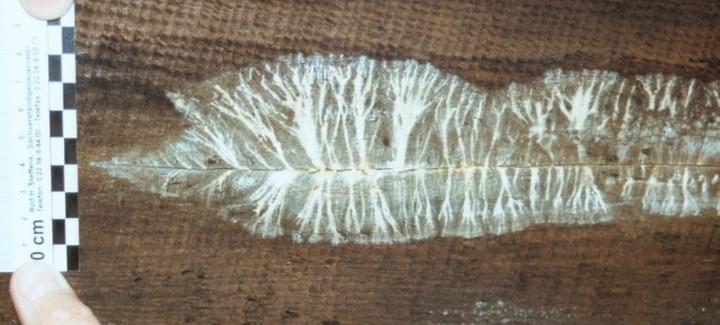 Bei Schäden durch Weißfäulepilze wird im Holz das Lignin – ein brauner Holzbestandteil – zersetzt und es bleibt weiße Zellulose mit geringer Festigkeit übrig.